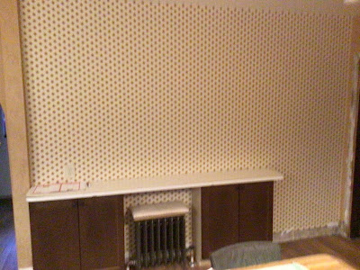 Above is a picture of the wall as she gets started. I have the laser level aimed at the wall for her to help get the first piece square as it is glued to the wall.This wall paper is especially difficult to work with because it has no self adhesive. She has to apply the glue to each piece. The reason it doesn’t have its own adhesive is an indication of how old it is.