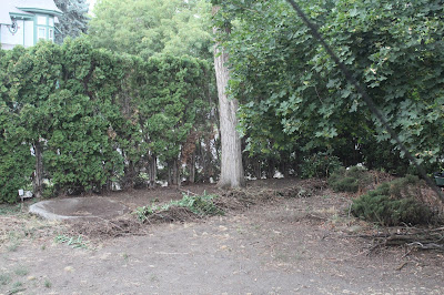 This is what the yard looked like yesterday.Here we are after todays' work. I know that the side yard still looks like a barren wasteland but it is becoming a barren wasteland that we are controlling.We got out into the yard about 1:00 and the goal was to get all the leafy, sticky, frondy crap into bags and off to the dump. By 2:30, we had to stop to allow a downpour to pass over us.